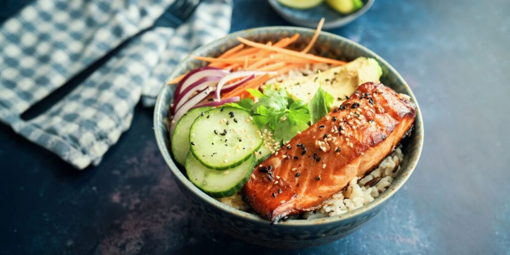 Spicy Salmon Bowl With Rice, Carrots, Cucumber & Avocado